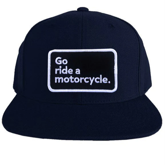"Go ride a motorcycle" Premium Snapback Hat. Original "Go Ride A Motorcycle" patch sewn front and center, with small Crown Moto logo tag on the side of this premium snap back from trusted brand Yupoong.